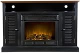 Classic cottage styling, two-tone black with warm, reddish walnut finish, and multipurpose functionality make this exquisite electric fireplace media stand a perfect choice. Wood and paint are distressed with small wormholes and imperfections to add character. Louvered cabinet doors on each side of the firebox house an adjustable shelf for plenty of media storage. A large open shelf boasts space for receivers and game consoles. Features 1 media shelf, 2 cabinets, and 2 adjustable shelves and offers 2 cord management openings. The firebox has realistic, multicolor flickering flames and glowing embers with an interior brick design for a more lifelike look. Combine with a flat screen TV and any room in your home will become the favorite. This electric fireplace features energy efficient LED and requires no professional installation, making it a cost effective way to upgrade your living or media room. LED lights also offer optional down light illumination. Easy to use remote control offers