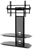 Accommodates most of the 32"-60" plasma, LCD/LED TV or not exceeding 150 lbs; Universal flat panel TV mounting system with 12 tilt up or down and 15 swivel left or right ; Constructed with tempered safety glass with bevel edges and heavy gauge powder-coated scratch resistant metal with gloss black finish; Cable management system to hide wires & cables; holds at least 2 audio video components and a center channel speaker; Contemporary design compliments any room decor; Easy to assemble. Overall Dimensions: 40" W x 19 1/2" D x 56 3/8" H Usable shelves space: Top shelf : 26" W x 17 1/2" D Bottom shelf: 26" W x 17 1/2" D x 10" H Maximum supported mounting interface: 700 mm (W) x 400 mm (H) Weight Capacity: Top shelf: 80 lbs Bottom shelf: 185 lbs